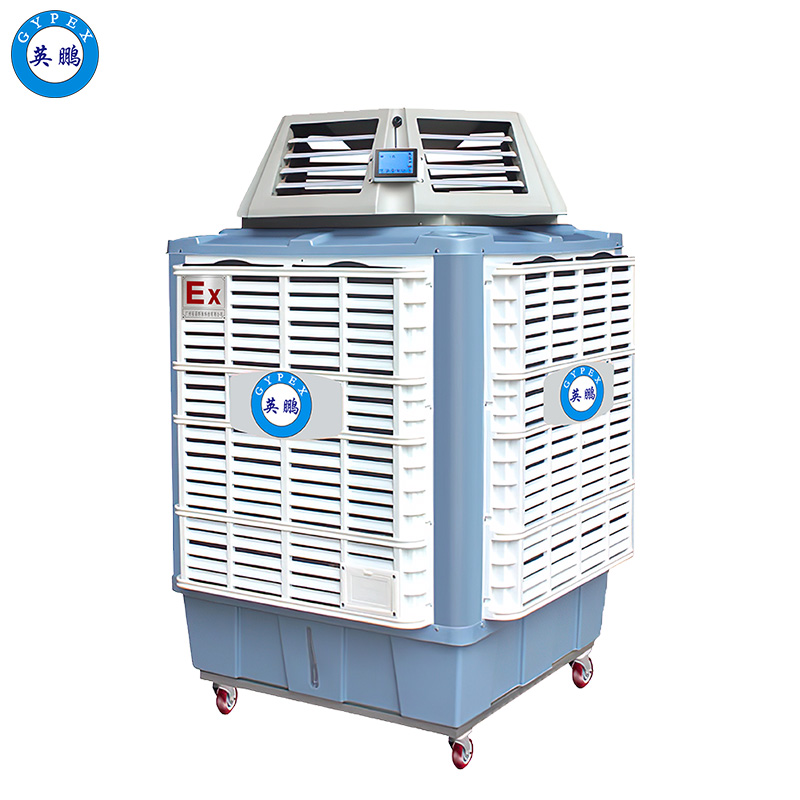 吸水泵将底座上的冷水一直抽打湿帘,利用水蒸发吸热的物理特性来冷却空气,利用水帘纸增大和空气的接触面积,空气进入到机内和水帘进行对流换热并得到冷却,然后,通过风机送入室内。